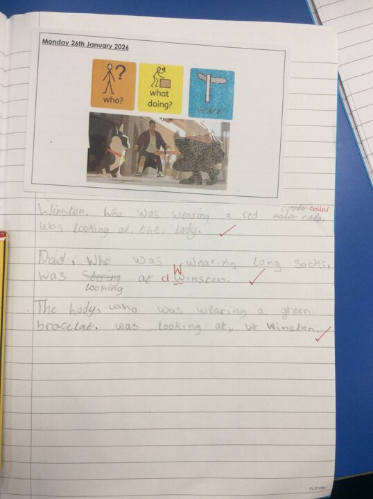 Today in English, we are continuing our work on the short animated film, 'Feast.' One of our objectives was learning how to enhance our descriptions using relative clauses to add extra detail for the reader!